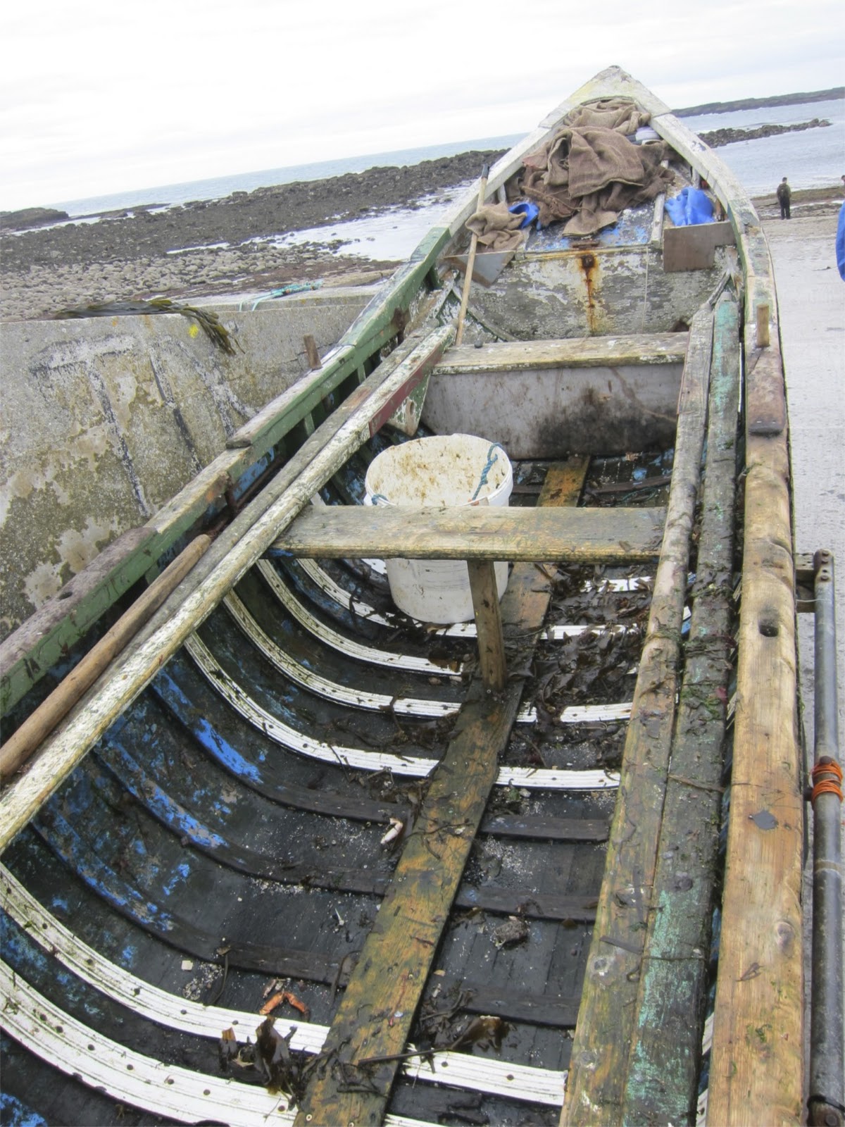 Then back along the coast, visiting the seven churches, where there are some beautiful celtic crosses (inspiration for future cables), passing the seal colony on the way. The boat below is a curragh, a tarred canvas boat used by the fishermen.